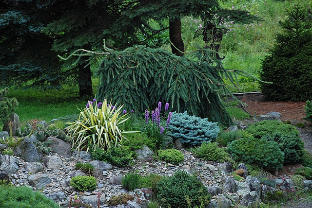 На альпийской горке не нужно высаживать хвойные растения слишком близко друг к другу, иначе теряется индивидуальность их форм. Компоновать растения в группы можно двумя способами: