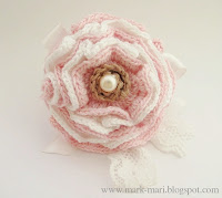 Диаметр цветочка - 6 см. Цветок получается объемным за счет пяти слоев лепестков. Серединка украшается красивой бусинкой. Я для этих целей использовала настоящие жемчужинки. Дополнительное украшение - кусочек белого кружева и белой ленты. Для работы понадобятся три клубочка: розовый, белый и коричневый хлопок, лента и кружево. Для моей пряжи отлично подошел крючок 1,3 мм.