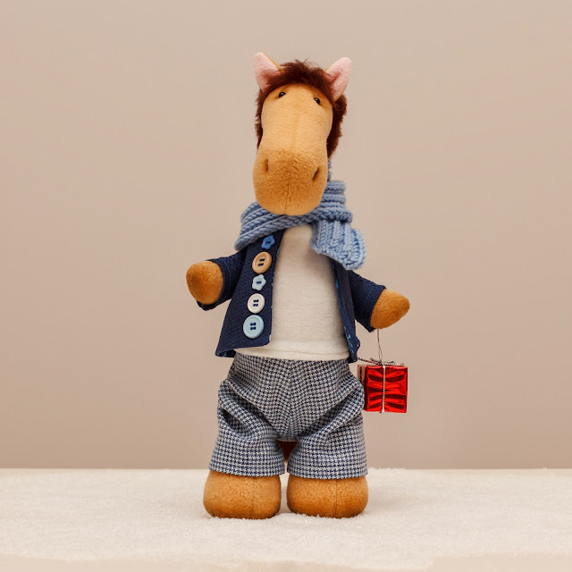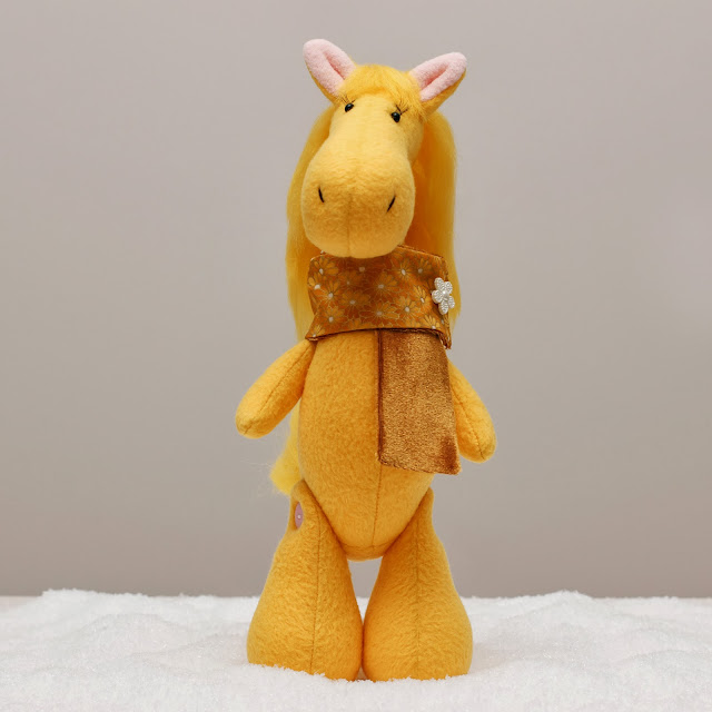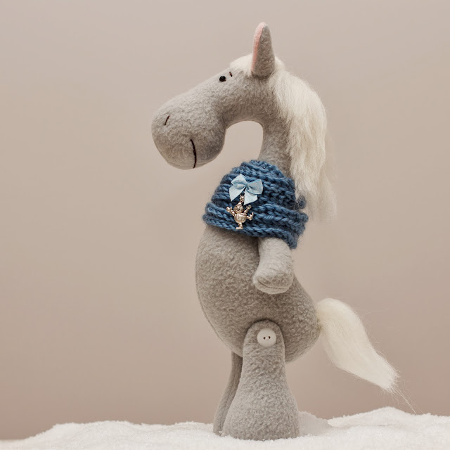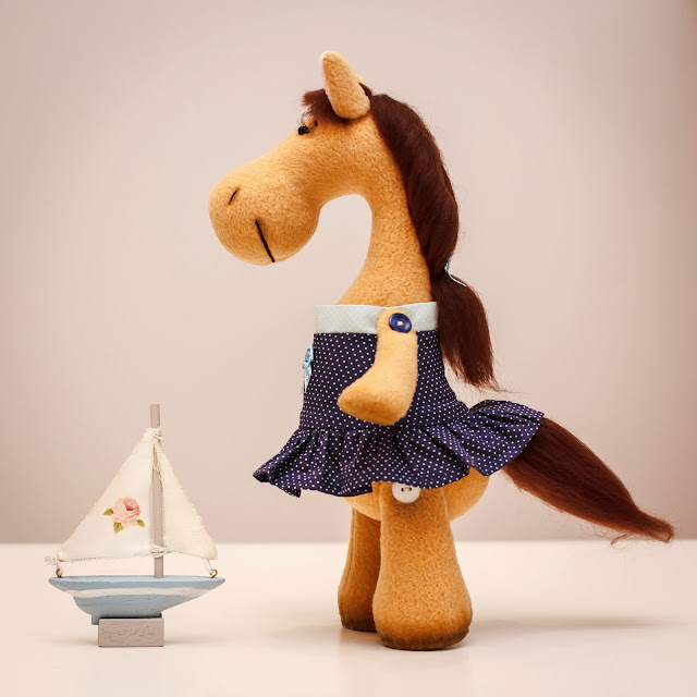 Лошадка сделана из флиса, тонирована масляными красками, грива и хвост из шерсти для валяния. Лапки на пуговичном креплении. Может сидеть и стоять. Рост - 30 см.