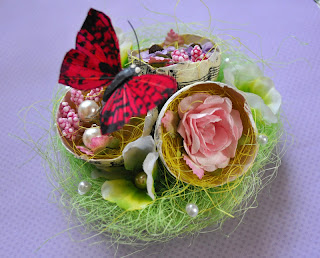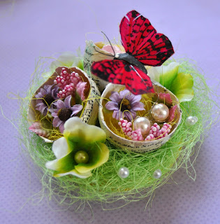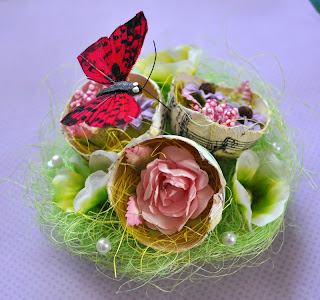 5. А теперь настает самый творческий процесс. Яички приклеиваем на гнездышко, и начинаем их декорировать всем, что у нас есть под руками. Это могут быть цветы, листики, бусинки, ленты, бабочки. Вообщем все, что вам подскажи ваша бурная фантазия.