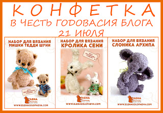 3 набора для вязания мишки Шуни, слоника Архипа и кролика Сени! У Вас будет возможность самостоятельно связать 3 игрушки в Технике Тедди или подарить выигранный приз людям, которые оценят такой подарок! :))