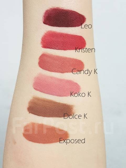 Мини-коллекция данной жидкой помады станет отличной покупкой, если вы ещё не пробовали какой-либо продукт фирмы KYLIE. Вы получите 6 мини-блесков объёмом 0,65 мл следующих оттенков: Exposed (теплый средний бежевый), Dolce K (глубокий бежевый), Koko K (бледно-розовый), Candy K (теплый розоватый), Kristen (теплый коричневый) и Leo (глубокий бордовый).