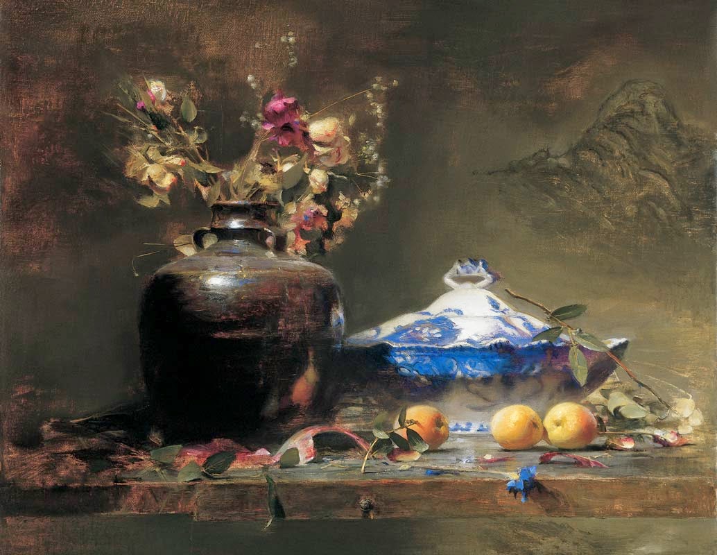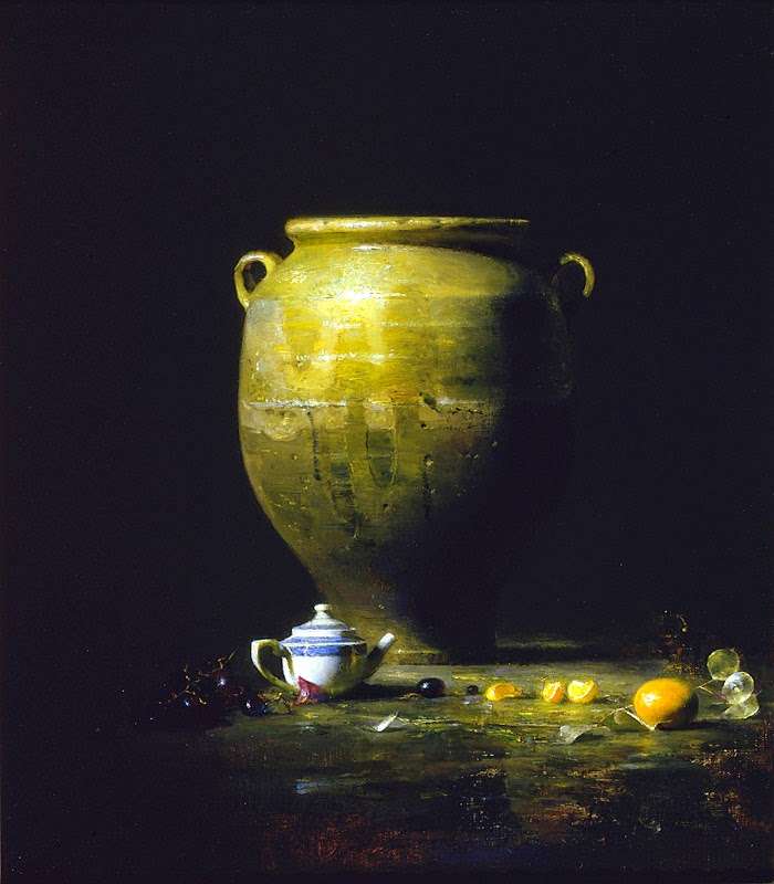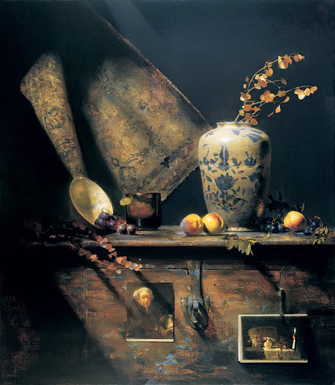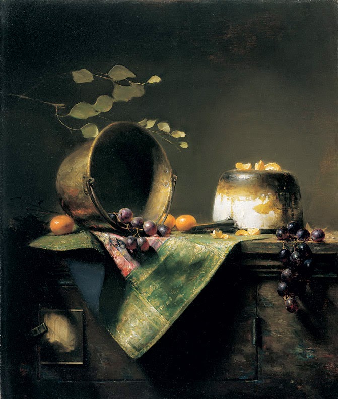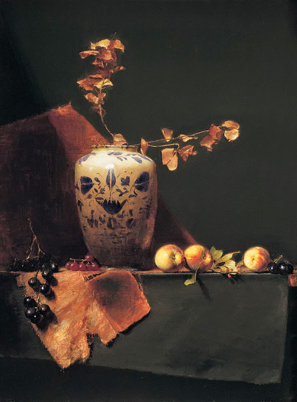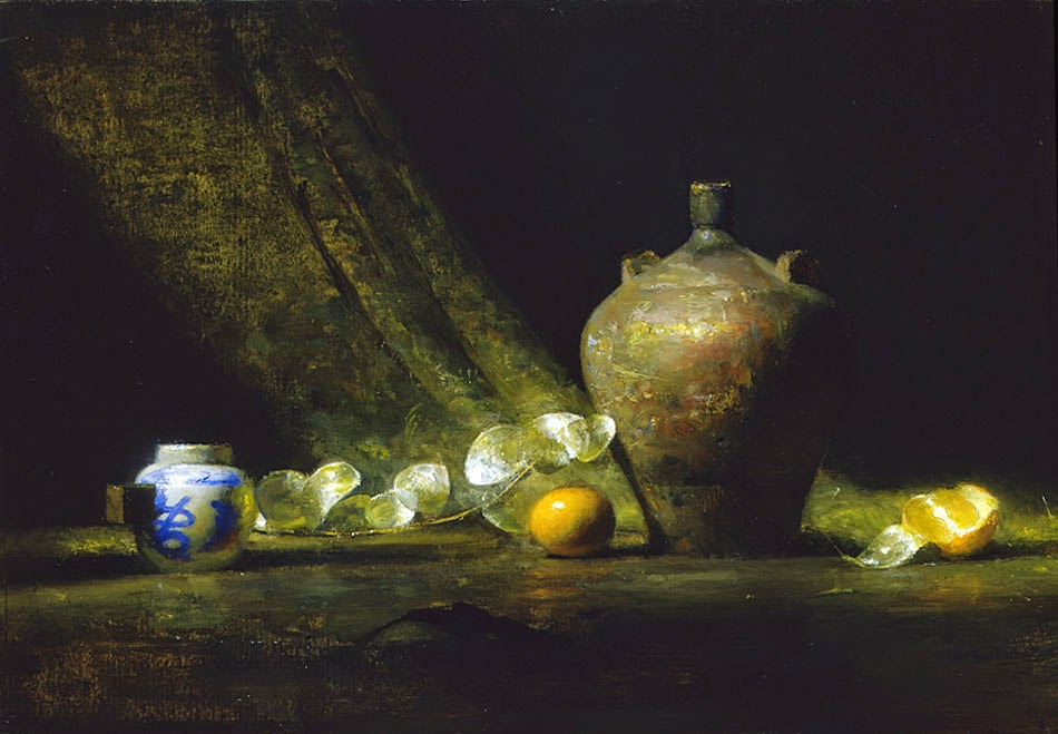 David A. Leffel is a twentieth-century artist who paints in the classic Flemish/Dutch old master style, much in the manner of Rembrandt or Chardin. His subject matter is Still Lifes, Landscapes, Portraits and figures, but the real subject of his work is the light as it gently drifts from one object to another. It pauses here, then moves on.