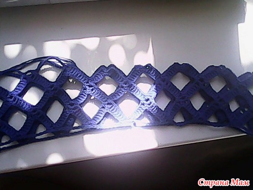 после того как я соединила вершинки цепочкой с воздушных петель провязуем ряд столбиков без накида. далее вяжу резинку с рельефных изнаночных и лицевых столбиков 2 через 2