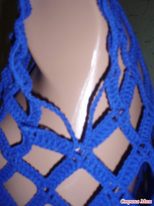 Вот что у меня получилось. довязав вкруговую до уровня проймы я поделила вязание пополам и начала вязать туда и обратно. Внимание вязание нужно распределить так чтоб у вас арки с воздушных петель попадали на изнаночную сторону а столбики на лицевую сторону(это для того чтоб соответствовал рисунок)