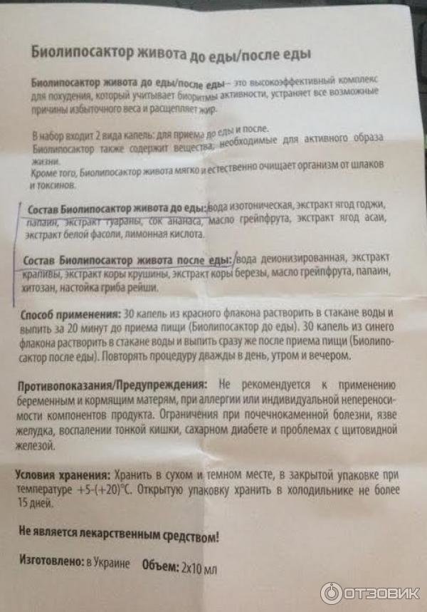 Перед тем как похудеть с помощью биолипосактора живота, советую внимательно ознакомиться с инструкцией по применению. Использовать препарат необходимо строго по схеме, ведь иначе результаты приёма капель будут неудовлетворительными. Оба средства употребляют 2 раза в сутки до и после приёма пищи.
