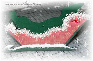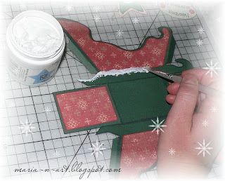 С помощью штемпельных подушкек ColorBox Жидкий Мел розового и зеленого цвета я затонировала края соответствующих деталек и линии сгиба на санях, чтобы сделать контуры более четкими и закрасить белые срезы бумаги: