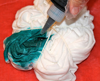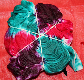 3.Делим футболку на 6 секций при помощи 3 резинок.