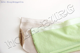 Проклеиваю края полочек нитепрошивной лентой. Стачиваю наружный край защитной планки на швейной машинке, срезаю припуск близко к строчке.