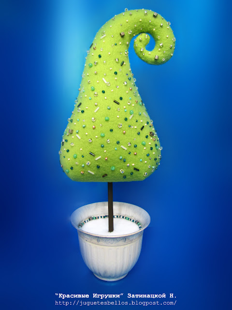 Елка сшита из флиса, расшита бисером и набита холлофайбером. Горшочек - пластиковый, покрашеный краской, емкость его наполнена гипсовой смесью. А палка - это палочка для суши, покрашенная акриловой краской. Гипс я скрыла белым флисом и края украсила ниткой бисера.