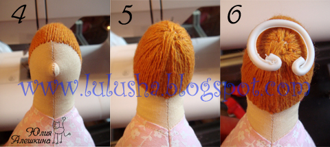 3. Идем по кругу. Когда нитка заканчивается, закрепляем на макушке. Узелки можно оставить там же
