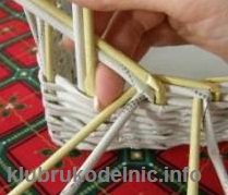 Если хотим сделать корзинку с ручками, так в том месте, где будем плесть ручку, нужно добавить еще один "прутик" и сплетем концовку. В месте, где мы добавили "прутики" для ручки, плетем до концовки добавленные, а из тех начальных сплетем ручку.
