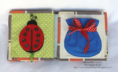 На семнадцатой странице сидит божья коровка. У нее подвижные крылышки (молния), усики (шнур с бусинами), черные точки можно трогать (пуговицы) и считать.