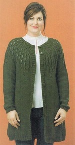 Кардиган с круглой кокеткой лицевой гладью и ажурным рисунком. Спицы. |