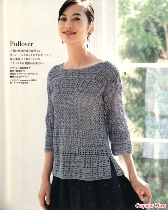 Джемпер с миксом узоров и разрезами по бокам. Крючок |