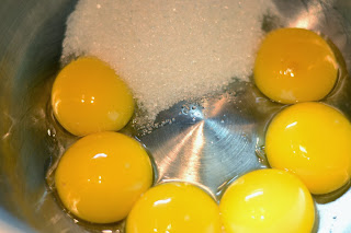 Разделить яйца на белки и желтки. Желтки взбить с половиной нормой сахара до густого состояния и бела,