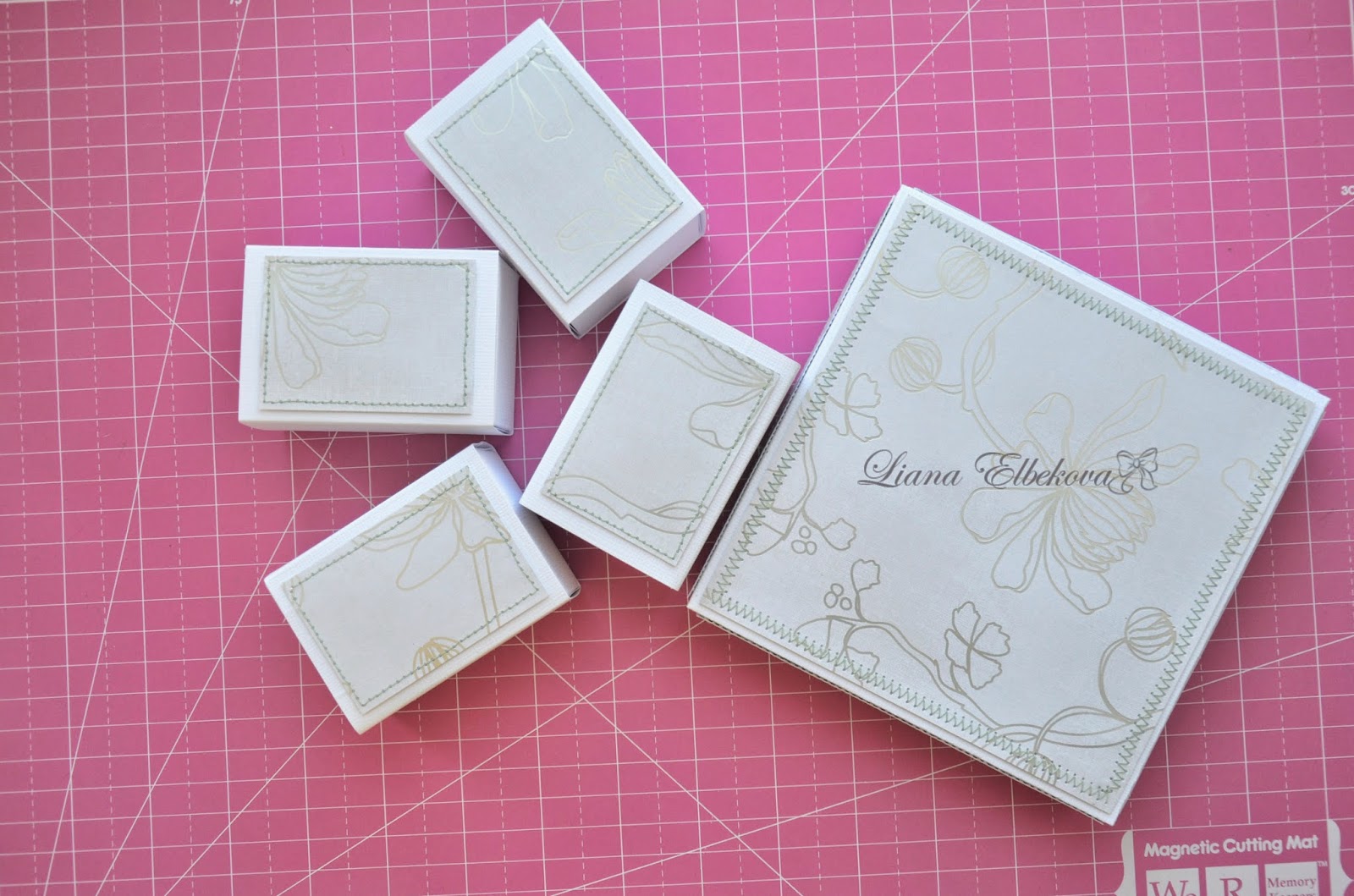 Мы будем делать шкатулку с 4 маленькими коробочками внутри. Я сделала такое расположение внутренних коробочков не случайно-оно помогает легко доставать коробочку из шкатулки без использования дополнительных "петелек", что очень удобно и легко!