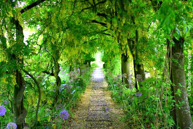 В аллее из ракитника, сплетенного ветвями (вероятно, этот пейзаж английского сада чаще всего фотографировали в конце XX в.), проходит дорожка, вымощенная флинтом и булыжником, а в конце ее роль фокусной точки выполняют каменный столб и скамейка. Весной, когда ракитник еще не полностью покрылся листвой, дорожку украшают полосы красных тюльпанов "Apeldoorn"; в июне под золотистыми ветвями ракитника появляются пурпурные стрелы лука голландского. Параллельно дорожке проходит длинный смешанный бордюр, где можно увидеть превосходные деревья и кустарники, в том числе вечнозеленые, а под ними пышные посадки травянистых однолетних растений. В другом конце осевой дорожки стоит храм XVIII в. с колоннами, придающий саду классической облик, контрастирующий с обильными посадками: кусты и деревья, под многими из которых высажены цикламены, подснежники и морозник восточный. Эти посадки сосредоточены вокруг пруда с лилиями, обрамленного каменным мощением.