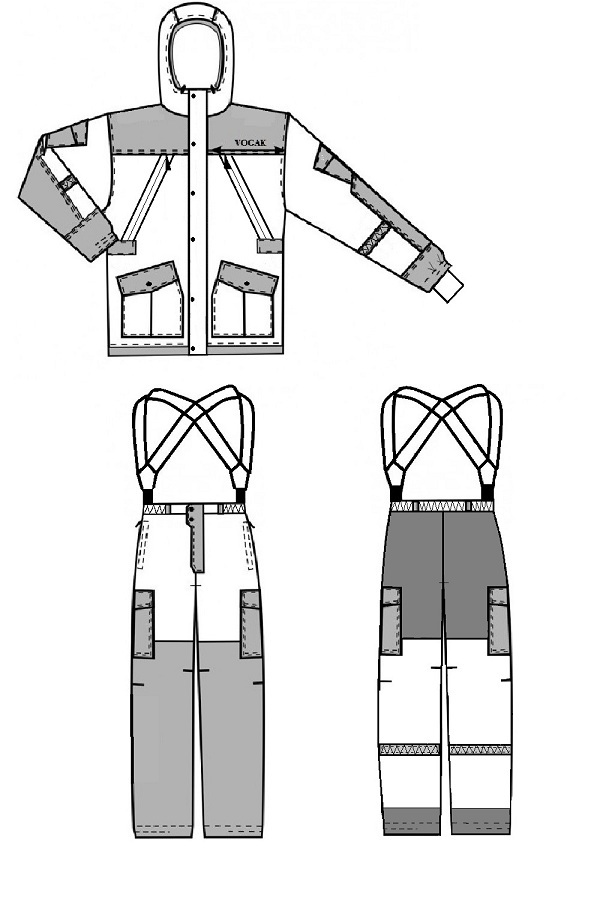 Куртка и брюки свободного покроя, что позволяет поддеть дополнительные слои одежды