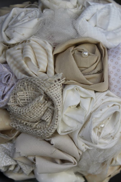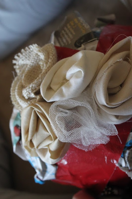 Обратите внимание, материалы для изготовления цветов автор берет самые разные - ситец, тюль и мешковина, шикарное сочетание. Легко сворачивает цветочные розетки и горячим клеем насаживает их на болванку:)
