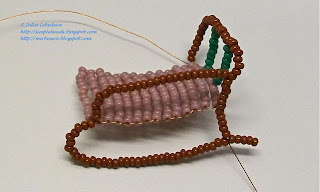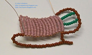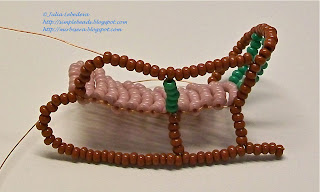 и, ведя проволоку сверху вниз, пропускаем этот конец проволоки сначала через 6 коричневых бисеринок внешней части спинки, примыкающих к сиденью, а затем сразу же - через 5 коричневых бисеринок, составляющих вертикальную опору между сиденьем и полозом санок.