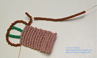 Далее набираем на этот конец проволоки 5 коричневых бисеринок и, ведя проволоку снизу вверх, пропускаем её между 9-ым и 10-ым рядами сиденья.