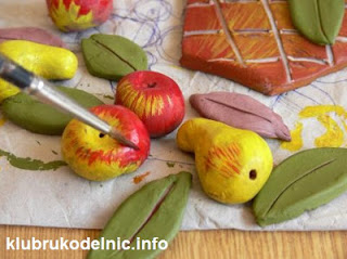 4. Из шариков сделаем яблочки и грушку. Снизу и сверху на них сделаем вмятины. Чтобы склеить отдельные детали, нужно места соединения смочить водой.