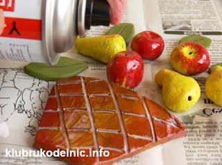8. После того, как высохнет краска, можно покрыть композицию глянцевым акриловым или мебельным лаком. Керамика приобретет вид цветной глазури. Нижнюю часть красить не нужно, чтобы фигурки хорошо приклеились.