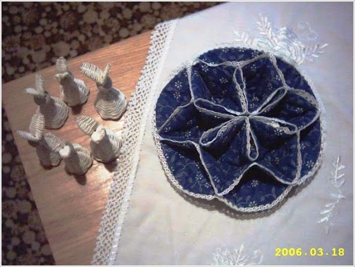 47. Выворачиваем салфетку грелки и выметываем кант на верхнюю часть салфетки. Приутюживаем салфетку и на шов прикалываем тесьму. Притачиваем ее машинной строчкой по верху. Концы тесьмы завязываем в бант.