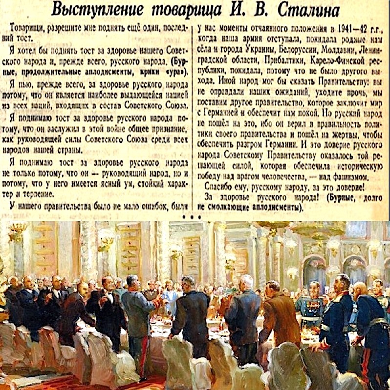 25 июня 1945 года в Москве в Большом Кремлёвском дворце состоялся приём в честь участников Парада Победы. Во время торжества выступил Иосиф Сталин, который сказал свой знаменитый тост за граждан СССР.