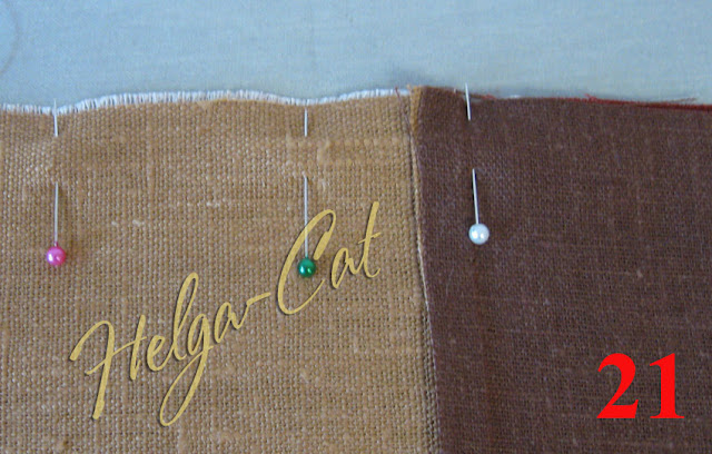 21. Скалываем булавками сначала в месте соединения швов, затем – срезы влево и вправо от шва по всей длине. Прострачиваем.