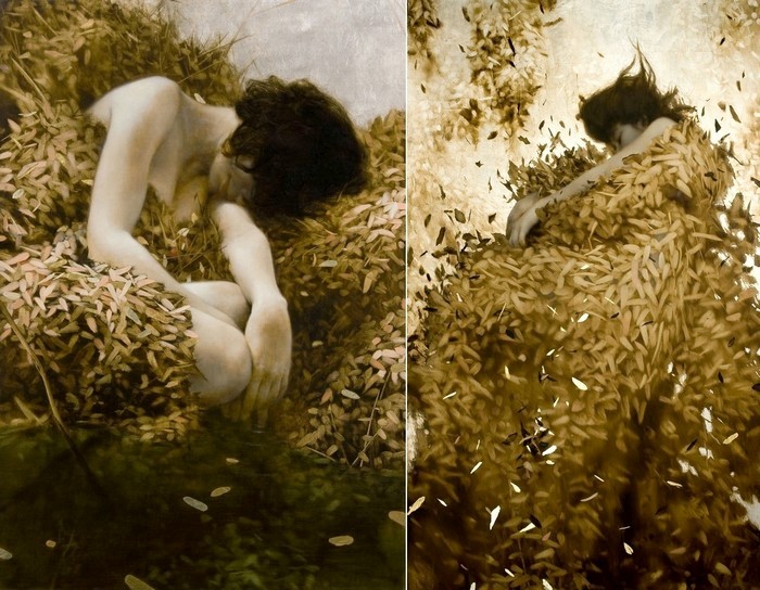 Не стоит быть искусствоведом, чтобы догадаться, - автор уважает творчество художников эпохи Возрождения, и использует в своих картинах их стиль, настроение и мотивы, а любовь к декоративности и чрезвычайное внимание к деталям выдает в нем поклонника модерна. Как и великие предшественники, Брэд Канкл использует масляные краски, однако картины пишет не на холсте, а прессованой древесине, которая добавляет работам фактурности. А чтобы добиться настоящего золотого оттенка в осенних красках, художник добавляет в масло изрядную долю золота и серебра. Вероятно, именно благодаря этому приему мы получили возможность любоваться тем светлым ореолом, которым окружены прекрасные незнакомки, купающиеся в осенней листве на картинах Брэда Канкла.