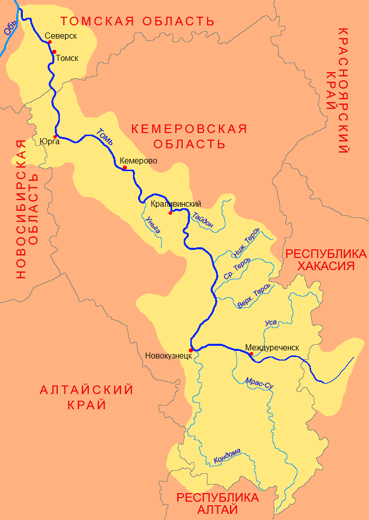 Река Томь является самой крупной в Кемеровской области, и правым притоком реки Обь. В верхнем течении, до впадения в нее притоки Мрас-су, Томь ведет себя как типично горная река. Часто встречаются пороги и горные перекаты. Берега реки здесь скалистые поросшие таежным лесом. Проходя через Кузнецкую котловину, река немного успокаивается, выход к берегам становится доступнее. В нижнем течении Томь превращается в типично равнинную реку, и неспешно неся свои воды впадает в Обь.