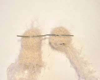 Обрезаю лишнюю длину "шерсти" вокруг пальчиков зайчика, стараюсь резать наискосок, неравномерно, так, чтобы не было видно четкого среза (делаю градуировку). Одна лапка подстрижена, вторая еще нет.