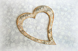 Обводим шаблон сердечка на бумагу, которую предварительно лучше проклеить плотным картоном. Используя штамп ноты ставим оттиск на бумаге, заполняя всю поверхность нарисованного сердечка.