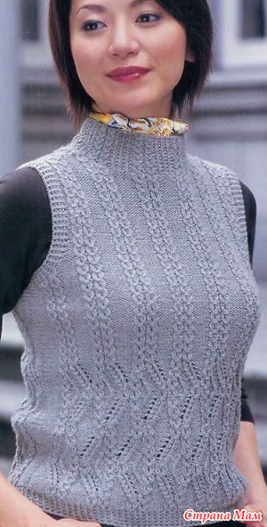 СПИНКА: на спицы №4 набрать 98 (106) 114 (122) 130 п. и вязать резинкой. Через 6 см от наборного края равномерно убавить 25 (29) 33 (37) 41 п. = 73 (77) 81 (85) 89 п. Затем перейти на спицы № 4,5 и вязать узором с «шишечками». Через 35 см от наборного края закрыть для пройм с обеих сторон 2 п. и в след. 2-м (2-м) 4-м (4-м) 6-м р. 1 х 2 п. = 65 (69) 73 (77) 81 п. Через 36,5 (36,5) 38 (38) 39,5 см от наборного края все петли закрыть.