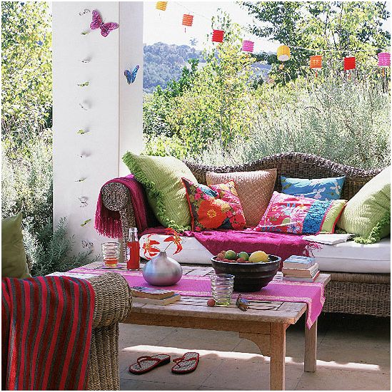 Плетеная мебель – классика жанра, а текстиль задает настроение.