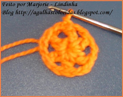 Começa pela florzinha. Fiz uma argolinha no dedo e coloquei 6 pontos altos separados por duas corr, para ficar com 6 pétalas a flor.