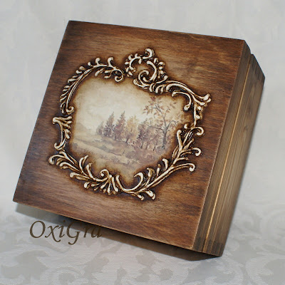 Порядок работы: заготовка ошкурена, покрыта водной морилкой цвета "дуб", крышка покрашена белым акрилом, на ПВА приклеены фрагменты декупажной карты, вокруг картинок покрасила темно-коричневым акрилом, через трафарет поставила точки, деревянный манекен и картонные детальки покрасила, поставила точки и затонировала битумом,  приклеила на ПВА, ручку, замочек и шурупы (были серебристые) покрасила черной аэрозольной краской, все покрыто тремя слоями акрилового лака, немного битума по краям.