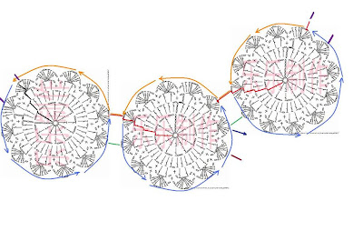 Первый мотив - левый. Черным цветом на нем обозначена цепочка подъема. Последний ряд мотива вяжем по синей стрелочке, т.е. половину ушка, 7 полных ушек и еще половину ушка. Переходим на следующий мотив. Цепочка перехода обозначена красным цветом и состоит из 20-ти возд. петель и 5-ти петель для центрального круга. Т.е. после того как мы связали 4 столбика с накидом ( половина ушка ), набираем 25 возд. петель, 5 из которых замыкаем в круг. Поднимаемся на три петли по цепочке, вяжем первый ряд по схеме, для второго ряда опять поднимаемся по цепочке перехода на три петли, вяжем второй ряд. В конце второго ряда вяжем две возд. петли, соед. петлю, затем втыкаем крючок в первую петлю цепочки перехода и заводим крючок под только что связанные две возд. петли и вытягивем петельку через две петли на крючке, поднимаемся на три петли по цепочке перехода. Это финт для того, чтобы сохранить рисунок мотива, т.е. чтобы столбик третьего ряда был немного смещен. Далее вяжем третий ряд по схеме. В конце третьего ряда делаем такой же финт, только крючок заводим между последним в ряду и первым столбиками. Поднимаемся по цепочке перехода на три петли, вяжем четвертый ряд. В конце ряда вяжем одну возд. петлю и крепимся в первую петлю цепочки перехода. Поднимаемся на три возд. петли по цепочке перехода. В этом месте от цепочки перехода должно остаться две возд. петли. Они пока остаются болтаться между мотивами. Вяжем последний ряд по схеме, в месте обозначенном зеленой черточкой провязываем крепление к предыдущему мотиву. Вяжем последний ряд по синей стрелочке. Цепочка перехода на следующий мотив также обозначена красным. Таким образом вяжем мотивы до нужной длины. При вязании последнего ряда последнего в ряду мотива нужно прикрепиться к первому мотиву в месте обозначенном фиолетовой черточкой ( нижней из двух ). Далее последний ряд последнего мотива вяжем по оранжевой стрелочке. Довязав последнее в ряду ушко, вяжем одну возд петлю, крепление к двум петлям, которые у нас остались болтаться между мотивами и далее вяжем столбик с накидом уже в предыдущем мотиве ( т.е. начинаем довязывать ушко предыдущего мотива). Таким образом довязываем верхние части всех мотивов, не забывая провязывать крепления в местах, обозначенных зелеными черточками. Довязав последнее ушко в первом мотиве вяжем одну возд петлю и крепимся к последнему мотиву. Это место обозначено верхней их двух фиолетовой черточкой. Все одна полоса для кокетки готова. Чтобы связать прямую полосу, на следующий мотив нужно переходить в месте, обозначенном темно-синей стрелочкой ( на втором мотиве ) и крепление в этом случае обозначено бордовой черточкой.