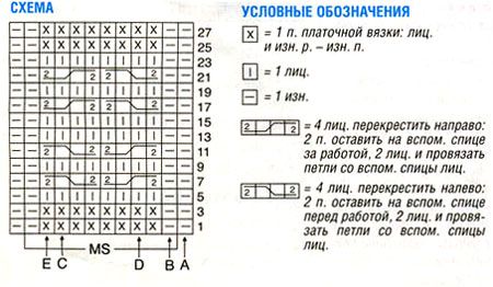 Платочная вязка: лиц. и изн. р. - лиц. п. Узор с косами (ширина 10 п.): вязать по схеме, на которой приведены только лиц. р., в изн. р. все петли вязать по рисунку или как указано. Повторять петли раппорта и с 1-го по 28-й р. Полосатый узор: попеременно 6 р. лиц. глади и 4 р. платочной вязки.
