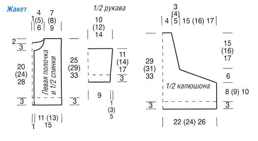 Выполнить плечевые швы; по краям полочек набрать по 56 (&4) 72 п. и связать планки застежки, как описано. По вырезу горловины и коротким сторонам планок набрать на круговые спицы 72 (80) 88 п. и связать планку, как описано выше. Выполнить швы капюшона. Капюшон вшить в горловину между планками. Вшить рукава, выполнить боковые швы и швы рукавов. Пришить пуговицы.