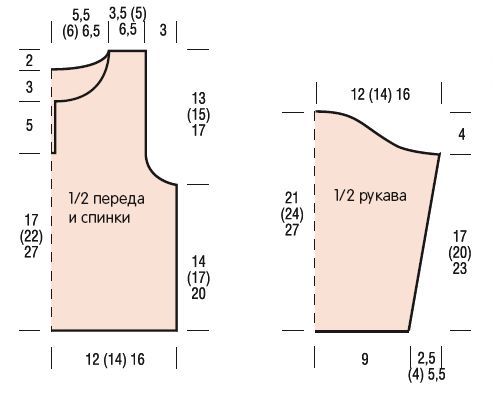 ПЕРЕД: вязать, как спинку, но с разрезом и более глубоким вырезом горловины. Для этого через 17 (22) 27 см от наборного края петли разделить пополам и обе стороны закончить раздельно. Через 22 (27) 32 см от наборного края закрыть для выреза горловины с внутреннего края 1 х 4 (5) 6 п. и в каждом 2-м р. 1 х 3, 2 х 2 и 2 х 1 п. На высоте спинки закрыть оставшиеся петли плеча.