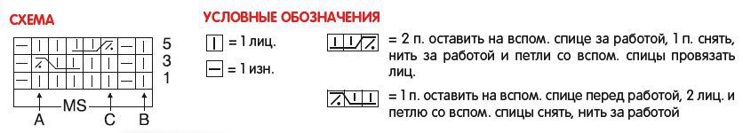 Рельефный узор, спицы № 4 (ширина 10 п.): вязать по схеме, на которой приведены только лиц. р., в изн. р. все петли вязать по рисунку, лиц. скрещ. – изн. скрещ. Повторять петли раппорта и с 1-го по 16-й р.