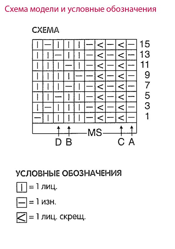 Ажурный узор, спицы № 4 (ширина 5 п.): вязать по схеме. Повторять петли раппорта и с 1-го по 4-й р.