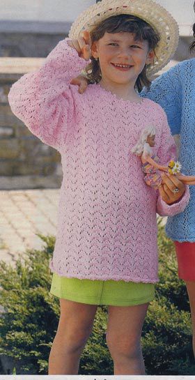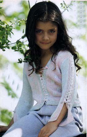 Вязать, как спинку, но с более глубоким вырезом горловины. Для этого через 7 см от начала пройм закрыть средние 15 п. и обе стороны закончить раздельно. Со стороны выреза закрыть в каждом 2-м р. 1 х 2 п. и 3 х 1 п. Через 13 см от начала пройм закрыть оставшиеся петли.