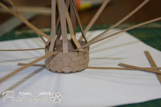 3. Вырезаем еще один кружок из крафт картона, только теперь уже точно 4 см в диаметре и приклеиваем сверху. Загибаем лучики наверх и плетем корзинку. 15 сантиметровой полосочки как раз хватало на окружность,Я каждую полосочку прихватывала клеем в начале и в конце круга.
