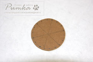 2. Каждый сектор делим двумя точками еще на 3 части. Из крафт бумаги нарезаем макетным ножом много полосочек. У меня они 150х5 мм. Потом эти полосочки приклеиваем по кругу вот таким "солнышком":