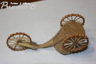 8. Сначала делаем "вилку". От деревянной "китайской палочки" отрезаем два кусочка такой длинны, что бы были чуть выше колеса (мерить от центра - оси) и приклеиваем к оставшейся палочке вот таки образом: