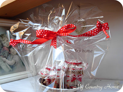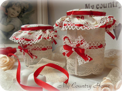 Банки предназначались сестре,у нее красная мебель,поэтому ПЭМ вставила в кружево красную ленту,